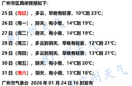 广东省气象台预计,1月24日广东大部分市县多云,早晨有轻雾局部有雾,昼夜温差大。1月25日—26日,广东大部分市县多云转阴天,有小雨或雾,雨雾天气能见度低,气温回升。1月26日夜间开始有新的一股弱冷空气影响广东,粤西北市县气温率先略降。